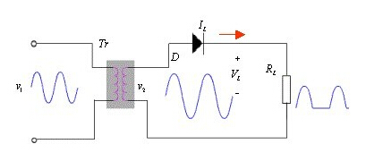 半波整流電路:半波整流就是利用二極管的單向導電性能,使經變壓器出來的電壓Vo只有半個周期可以到達負載,如下: